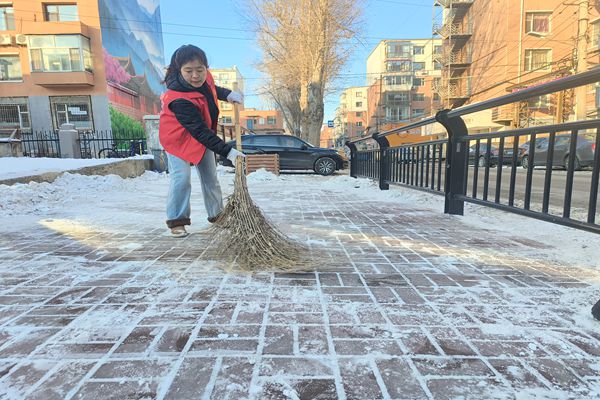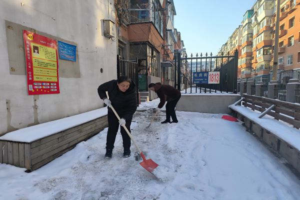 扫雪活动中工作人员将残障人士单元门设为重点清扫对象。工作人员带着扫帚,铁锹等工具将自己分担区的积雪进行清除,同时在路边撒上了防滑剂,确保来往出行人员的安全。