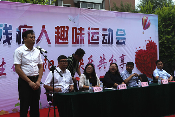 图为区委常委、副区长林继东宣布残疾人趣味运动会开幕